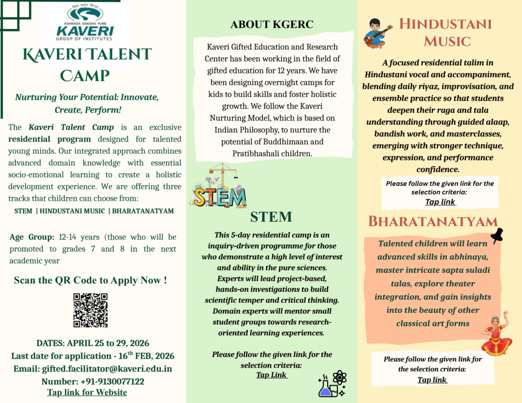 Kaveri Talent Camp 2026 is an exclusive 5-day residential program for gifted students aged 12–14, focused on nurturing creativity, critical thinking, and performance excellence.